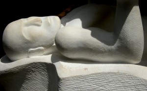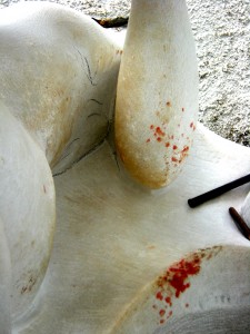 but my current two armpits can be equally as tough– it has begun to occur to me that i am truly beginning to approach the end of all this, this particular sculpture, no longer straining to find the vanishing point upon the horizon, but something, if a little fuzzy, still within viewing range. the past week and a half or so i have been trying to bring the lower figure up to a consistent finish, rasping and filing away, filling in some details as i went along. such is the case in the photo above, where i was forced to work in such a tight space, this narrow valley if you will, between the arm and body. but bits and pieces of the stone would drop away finally, tiny fragments, at the cost of some skin and blood. see all those red dots on the elbow of the piece, and down below? a day’s wages of blood, maybe less. hurts like the blazes too, even as i got a chuckle at the prospects of showing this off. awkward postures, sometimes working blind– chisels, rasps, knives, whatever to push that line back just a little further. it all looks pretty good now though, but hold on– there is another armpit to be cut. this one i have been working the past two or three days now, and it is difficult, but in its’ own unique ways– there is a big “stone”, upon which the right foot of the upper figure rests, and it blocks me very ably, so once more i am reduced to the “rat method”, gnawing away at something much greater than myself.