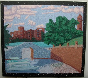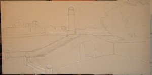 above you will see it as it was a couple of days ago, but it has progressed since then– the tower in the background, the “castle-like” club nautico, and the trees lining the little cove in the foreground. it’s coming together. wish i was one of those artists who are so facile with the pencil, throwing up the design onto the canvas, but alas i am not– i am slow indeed!! but i seem to always get there just the same– take a look!!