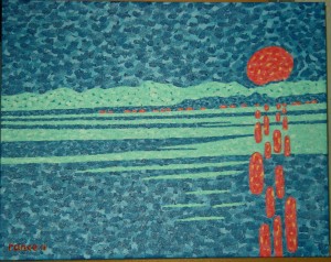 but more about the de-balling of said moths later. in 96 i did a small pen and inker, a simple piece really, just an idea– a sunset in a semi-abstract manner, which languished in my portfolio for quite some time, until recently, when it suddenly sold. i know the picture i have of it above is crappy, but it is the one i have. however, someone else also had her eye upon it, and so i volunteered to do a painted version of the piece, which i just finished up a couple of days ago.