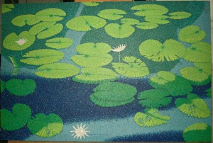 jeez, but i am a blathering fool– let’s get back to those moths and stuff!! a couple or three years ago i began a series of paintings of lily pads– i say i began it, as it stalled after a certain amount of time, and this piece pictured above– the first in the “series”– sat moldering on my easel (well, what i was using as an easel at the time, anyhow) for months, i unable to put a single stroke onto it and annoyed as hell about the whole deal. i was thinking about what i wanted to do next, and my eye fell upon the edge of this piece– it was stuck behind some other pieces where i was sure not to see it, but for some reason it stuck out for me right then, i pulled it out and put it onto my new official easel, and i just knew what i had to do with it– i’m going to repaint the lighter water areas, and the shadows of the trees in the upper half of the painting– well, i am JUST GONNA GET RID OF THEM!! they have always bothered me anyhow, and besides– reality is overrated at times, better to go with what feels good. i guess that lots of mistakes have been made with that particular attitude before, i’ll just have to see if this is one of them– wish me luck please!!