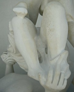 as i mentioned, i have been out working on my sculpture again– finally!! true to form, i baptised it quickly with my blood and sweat, filling my eyes with stone dust– ahhh, it don’t get much better than that, man!! but both yesterday and today i had to FOCUS MIGHTILY– i decided that the time had come to do the piercing in the area between the legs on the middle figure. i have been procrastinating on this for a while now, out of fear– it does weaken this area somewhat, and i was loath to do anything like that. however, the day had to come sometime, and so i girded twice my loins and, trying hard not to speak soprano, i went to work. things have gone quite well these days, and the work is slowly melding together, one detail moving again into another. but i had one huge surprise this morning– when i opened it up underneath the figure’s left leg, they didn’t quite match up!! i was a quarter inch away, necessitating some work to bring both sides into harmony. normally i am very adept at matching the areas up, it was quite a shock. i had anticipated making two piercings in this area, but i now see i shall have to do yet another, smaller one– not today though!!