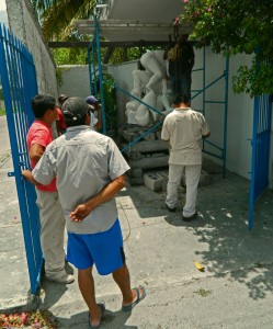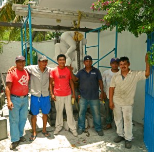 when i bought this piece of stone about 20 years ago, the crane deposited it on the top of an old wood pallet. with another board to even the block out it has stood that way ever since. now, up in colorado it was no big deal– it’s dry up there and relatively pest free. but not cozumel– nossirreebob!! cozumel presents several buttloads of problems. tropical rain is one of them, and the ever present ROT (here’s where the english teach would give me extra points for versimilitude, hinting at this earlier on)– plus we have all this marvellous salt air. everything rots here– hell, stainless steel rots here, hard to believe. and then there was the army of termites that chose to invade my little studio. they kept on coming and coming, just like the battle of the little big horn. the platform that the sculpture sits on is made of zapote wood, the stuff they made the lintels over the doorways of the pyramids here out of– almost indestructible. but that poor pallet!! it seemed to take eons to get rid of the termites, and by then they had done a lot of damage. as i began to close in on finishing up my sculpture i came to realise that the pallet’s days were numbered– sooner or later, it was going to fall, and my dreams with it. i agonised with plans to remake it, but nothing i could conceive of was going to work. finally i spoke with my friend hector– he has done a lot of work for me, and all of it good. was there something we could do? we came up with a plan, and this morning we were going to put it into practise. unfortunately, it was the wrong plan.