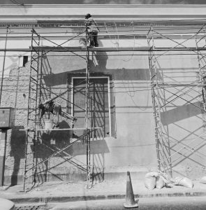 right from the beginning with this painting i had sketched in two bags of gravel in the right foreground, by the base of the scaffolding. i ended up deciding that they were extraneous and distracting detail, so i painted them out. this required my overpainting all the sidewalk by the right hand building, but it bore a silver lining– i could employ the brushstroke i was using in most of the rest of the piece, make it more a part of the overall image. it also made me realise that i was truly in synch with what i was doing.
